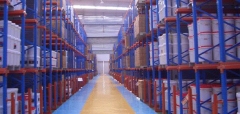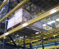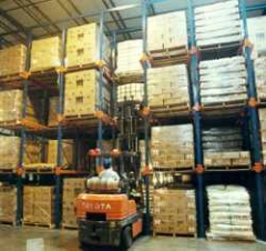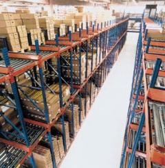 Drive In and Drive Through Rack: These racks take the idea of the double deep rack and let you go even deeper - 10 or more pallet positions deep. The catch is that you must load the rack in a sequence similar to the way you would stack pallets on the floor. The rack has tracks on each pallet level, and the driver must lift the pallet to the appropriate level prior to entering the rack, and then you must drive in a narrow space to place the pallet down. Experienced and careful drivers must be used. This type of rack can have up to 5 or 6 pallets levels. A traditional sit down truck can be used to load and unload the locations. Drive through track lets you actually go in one end and come out the other, while drive in rack permits access from only one end. Drive in and drive through racks cost only a little more than traditional pallet rack per pallet position. This type of system can improve storage density 40-60% over traditional selective rack.