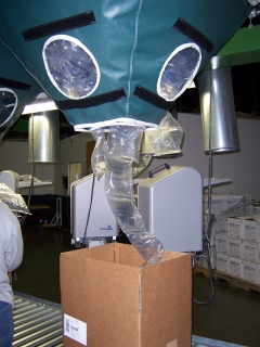 - Overhead Dispensing Systems - All void fill systems can be set up to be dispensed from an overhead dispensing system. The advantage of an overhead dispensing system is that materials can be brought into the void under the force of gravity. Slower systems can be used at a single pack station. High-speed systems can be used “in-line” when a train of open boxes is fed under the dispenser. Depending upon the type of system used, overhead systems can dramatically speed up the time to fill a single order.