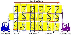 Pallet Flow Rack and Push Back Rack: A more expensive, but easier to access system that allows the same storage density as drive in/through rack. Since you don't enter the rack, you can access any position or level, but only the outermost pallet. Push back rack lets you store and retrieve pallets up to 6 pallet positions deep from a single selective face, and the faces can be stacked up to 6-7 levels high. Pallet flow rack lets you go even deeper, and feed in pallets from one side and pick them out from the other. Again, you can select any face at any level. Pallet flow is great for FIFO applications, but it does require an additional access aisle. Both solutions are only suitable when you have large on-hand pallet quantities of a single SKU (usually 10 or more). These systems can cost from twice to several times the cost of traditional selective rack.
