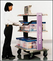 A tugger may have a chain of carts behind it, with each shelf containing requirements for a particular order. Alternately, it is possible to pick all the materials for the batch en-masse without placing to order, and then pick from the shelves of the carts once they are delivered to the pack station.